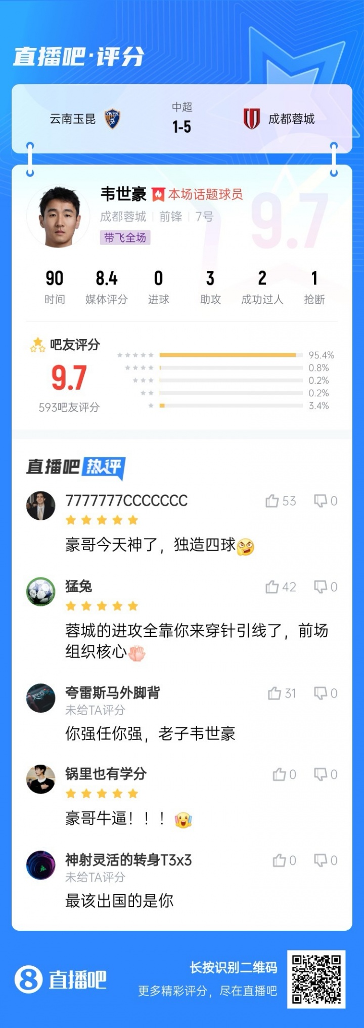 【】中超第五轮最佳球员:李源一!吧友评分9.9国产助攻王