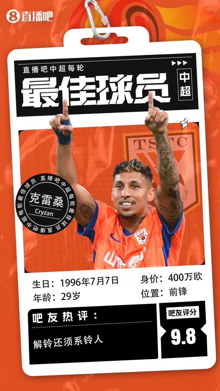 【】中超第二轮最佳球员:克雷桑毫无悬念当选,评分9.9!