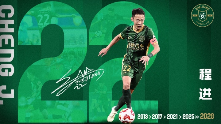 浙江队发文:近日,浙江职业足球俱乐部与程进完成续约,本次合约将持续至2028赛季。未来,浙江FC青训1995届的优秀毕业生程进将继续为浙江而战!